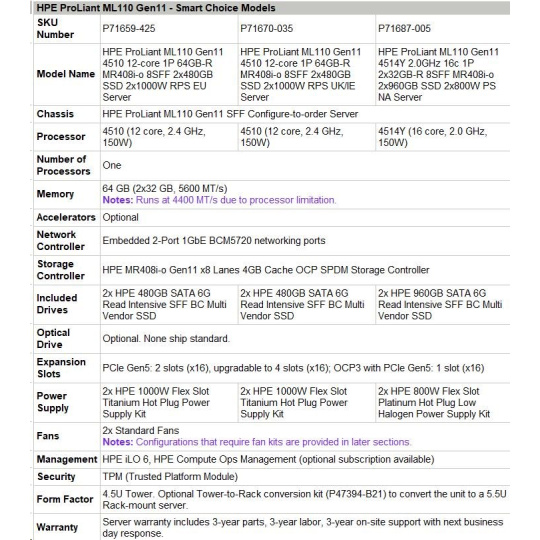 | Chassis | HPE ProLiant ML110 Gen11 SFF Configure-to-order Server |