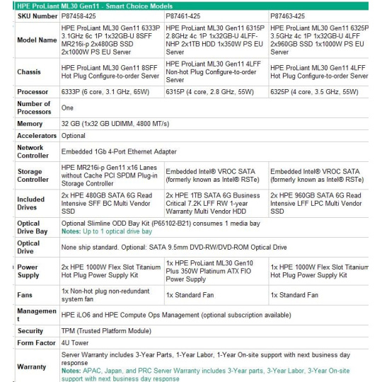 HPE PL ML30g11 6325P (3.5G/4C8T) 1x32G 2x960G SSD SATA 4LFF-HP VROC 1x1000W 4p1G NBD311 Smart Choice