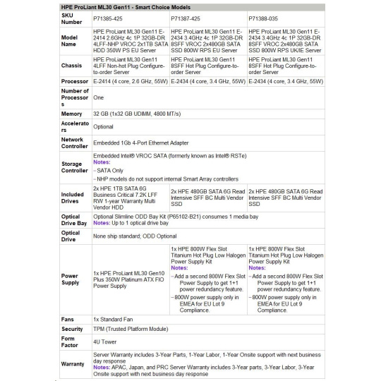 | 1 | P65090-B21 | HPE ProLiant ML30 Gen11 4LFF Non-hot Plug Configure-to-order Server |