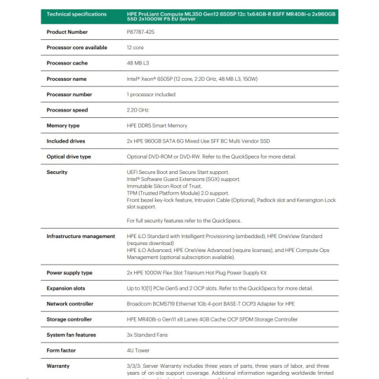 HPE PL ML350g12 6505P (2.2/12C) 1x64G (P69728) 2x960G MR408i-o 8SFF 2x1000W 1GbE NBD333 Smart Choice