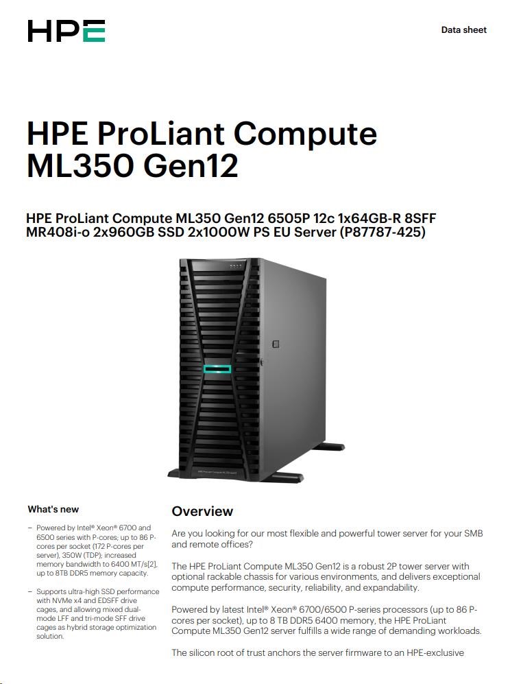 HPE PL ML350 Gen12 6505P (2.2/12C) 1x64G (P69728) 2x960G MR408i-o 8SFF 2x1000W 1GbE NBD333 Smart Choice.