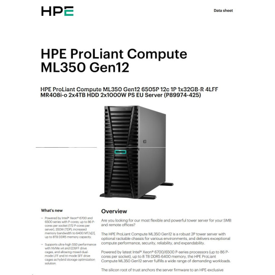 HPE PL ML350g12 6505P (2.2/12C) 1x32G (P69728) 2x4TB 4LFF MR408i-o2x1000W 1GbE NBD333 Smart Choice
