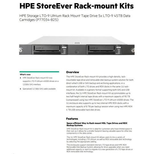 HPE StoreEver Rack-mount Kit is ideal for customers who have limited space in their rack as it allows for a smaller footprint leaving valuable space for other key components in the data center. The 1U HPE StoreEver Rack-mount Kit allows users to mix a variety of technologies, including LTO Ultrium, as well as RDX removable disk technology by selecting the appropriate cabling. The enclosures support standard internal LTO tape drives and HPE RDX Removable Disk Backup System, allowing for drive upgrades when you need additional capacity or want to migrate to a new generation of LTO tape drives or RDX removable disk technology.Data sheet Page 2 Provides up to 90 TB of storage capacity (assuming 2.5:1 compression) using two LTO-9 Ultrium 45000 drives or up to 8 TB of storage capacity using two RDX 4 TB removable hard disk drives. Data transfer rates up to 300 MB/s using LTO-7, LTO-8, or LTO-9 Ultrium drives or up to 30 MB/s using two RDX removable hard disk drives.