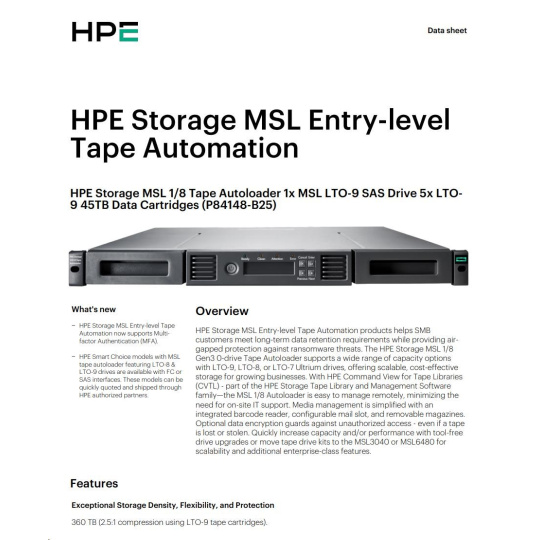 HPE Storage MSL 1/8 Tape Autoloader 1x MSL LTO-9 SAS Drive 5x LTO-9 45TB Data Cartridges