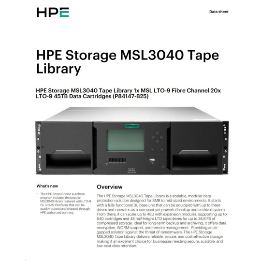 HPE Storage MSL3040 Tape Library 1x MSL LTO-9 Fibre Channel 20x LTO-9 45TB Data Cartridges