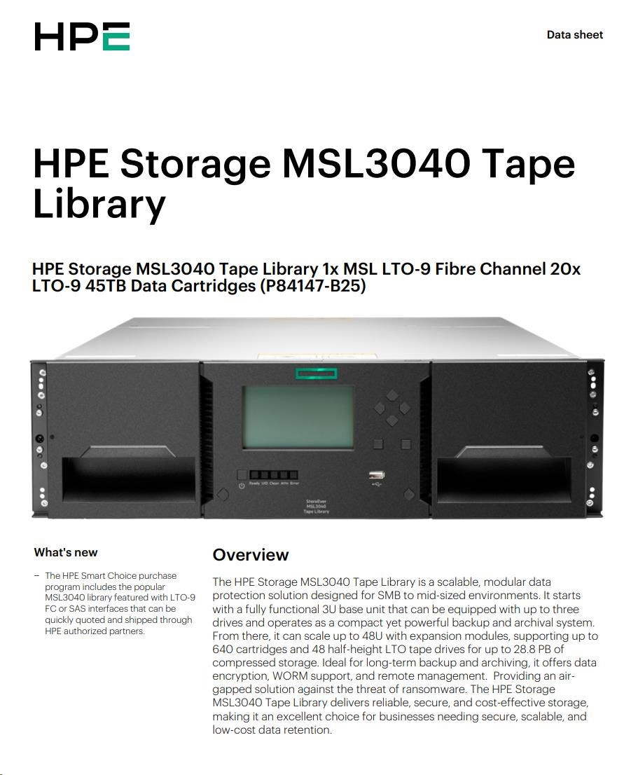 HPE Storage MSL3040 Tape Library 1x MSL LTO-9 Fibre Channel 20x LTO-9 45TB Data Cartridges
