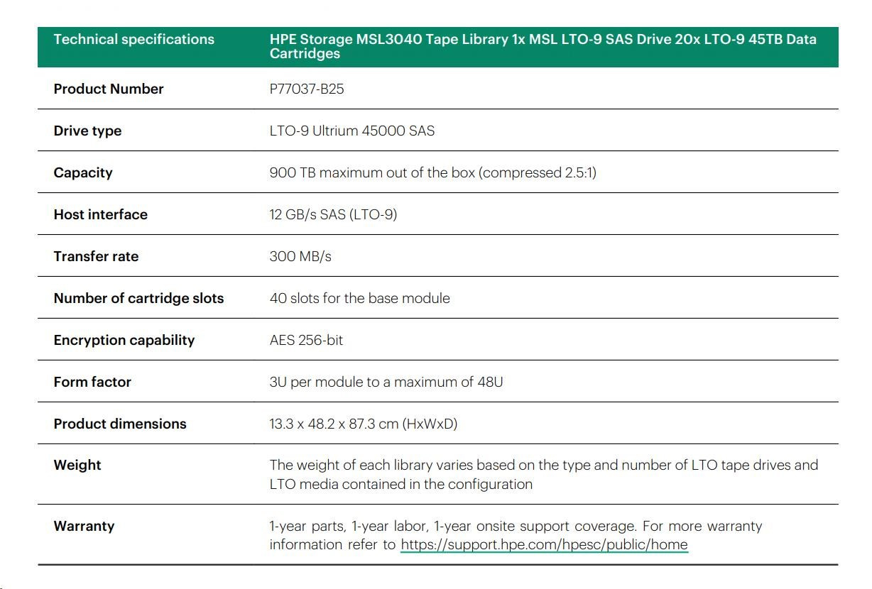 HPE Storage MSL3040 Tape Library 1x MSL LTO-9 SAS Drive 20x LTO-9 45TB Data Cartridges.