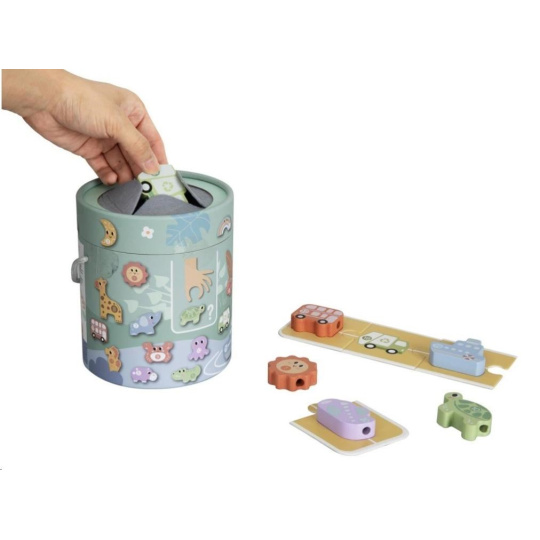 Balení obsahuje: kyblík, 20 dřevěných předmětů v podobě očíslovaných zvířátek, ovoce, dopravních prostředků a motivů z oblohy, 20 hracích kartiček v podobě puzzle, 2 provázky k navlékání.
