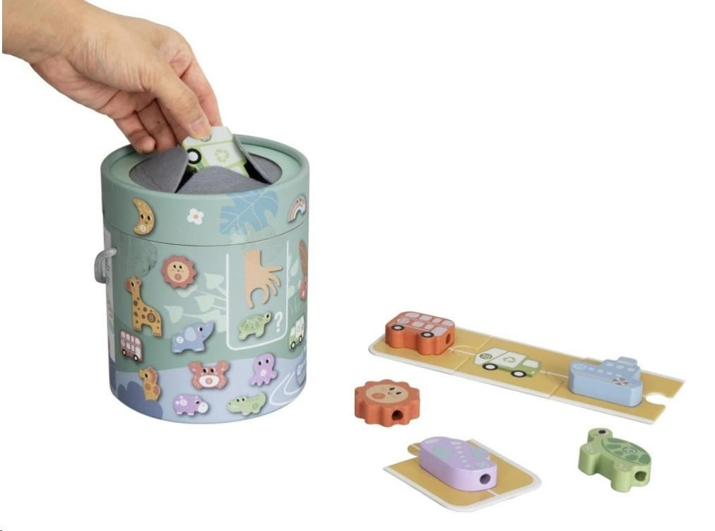 Balení obsahuje: kyblík, 20 dřevěných předmětů v podobě očíslovaných zvířátek, ovoce, dopravních prostředků a motivů z oblohy, 20 hracích kartiček v podobě puzzle, 2 provázky k navlékání.