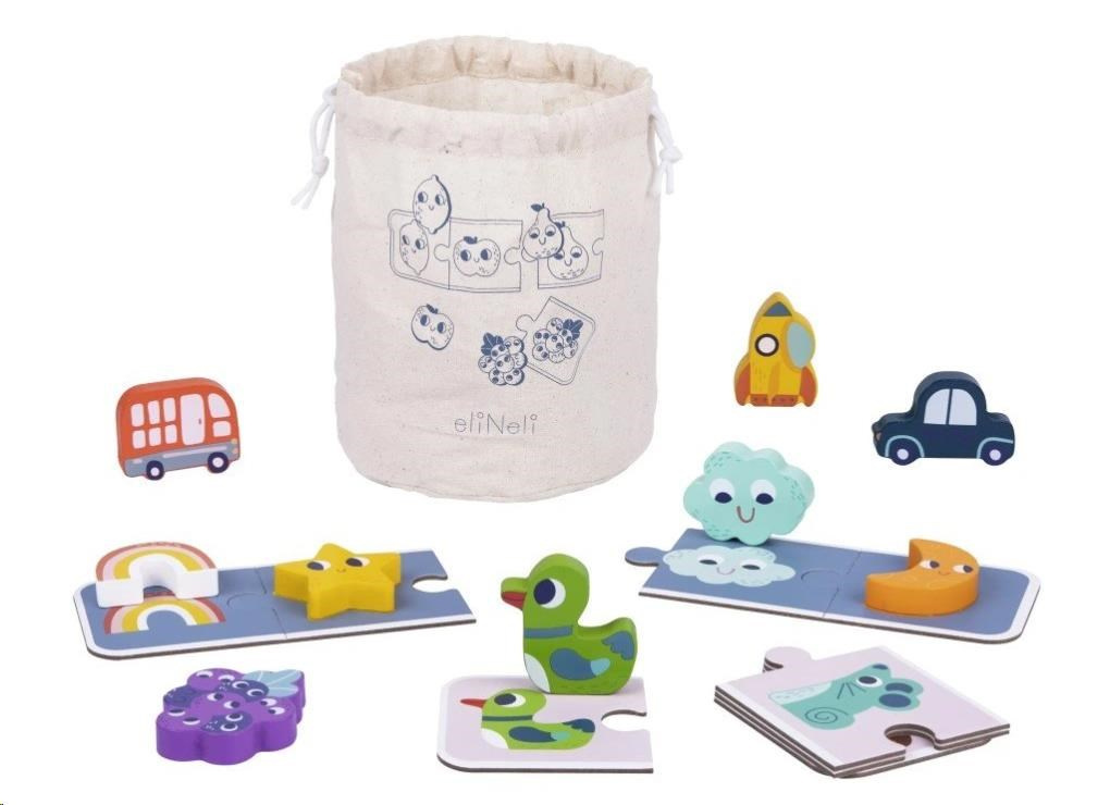Balení obsahuje: bavlněný stahovací pytlík, 16 dřevěných předmětů v podobě ovoce, zvířátek, dopravních prostředků a motivů z oblohy, 16 hracích kartiček v podobě puzzle.