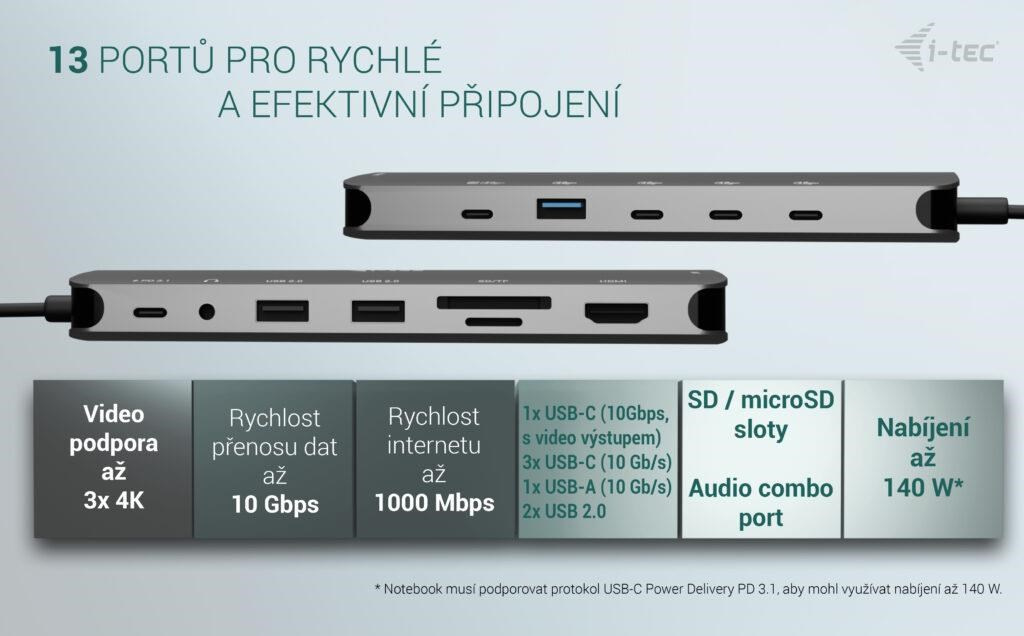 * Pokud váš notebook nebo tablet podporuje nový a moderní nabíjecí protokol USB-C Power Delivery PD 3.1, dokovací stanice nabídne nabíjecí výkon až 130 W (pokud máte PD 3.0, nabíjecí výkon bude až 100 W).