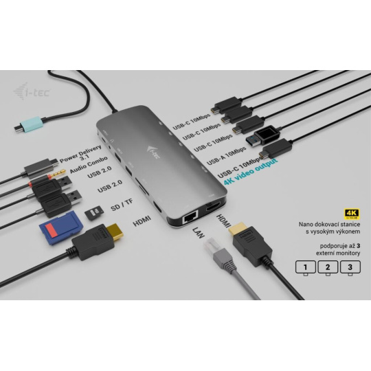i-tec USB-C Metal Nano 3x Display Dock, 2x HDMI 1x USB-C video + Power Delivery 140W