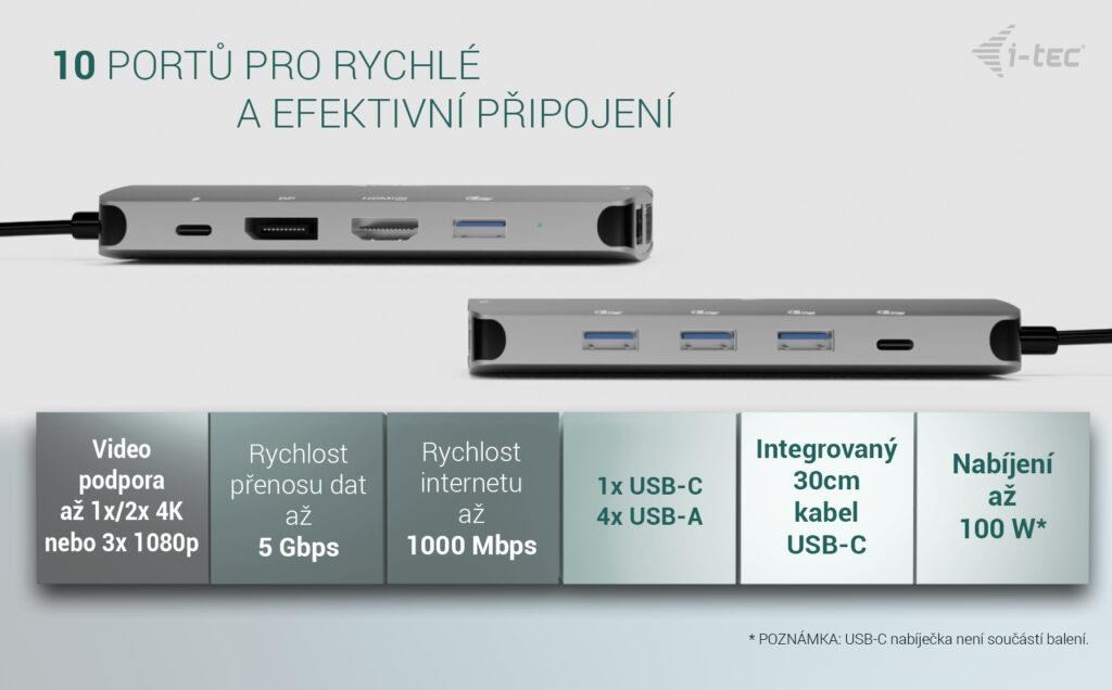 Samozřejmostí je podpora napájení přes USB-C Power Delivery až 100 W**, takže můžete svůj notebook nebo tablet nejen připojit, ale zároveň i nabíjet – vše jedním kabelem.
