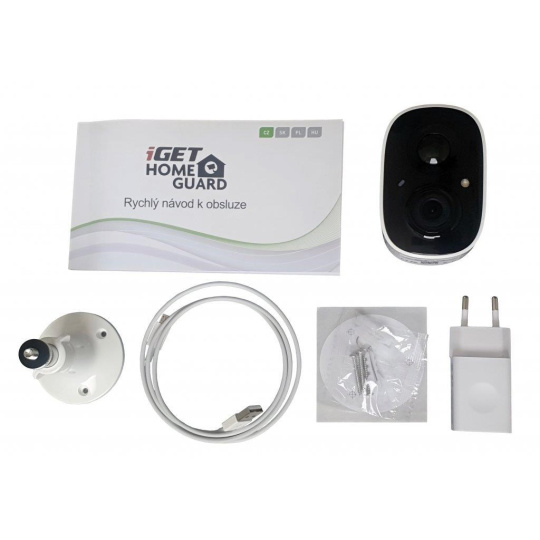 - Obsah balení: kamera iGET HOMEGUARD HGWBC351, rychlý návod k obsluze EN, CZ, SK, HU, napájecí adaptér 5V DC 1.5A, kabel USB/microUSB 1m, nastavitelný šroubovací držák pro upevnění kamery na stěnu/strop, hmoždinky a šroubky pro montáž, šablona s vyznačením montážních otvorů, nálepka s výstrahou o zabezpečeném objektu