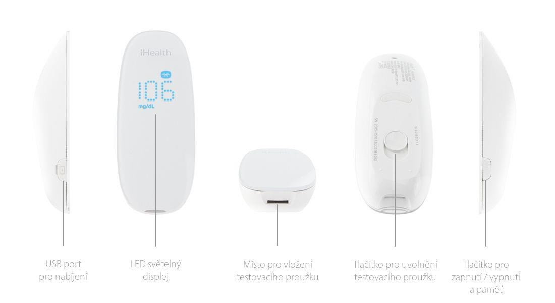 Model Gluco+ BG5S Certifikace CE jako zdravotnické zařízení Měří aktuální glykémii z kapilární krve Bezdrátová komunikace Bluetooth V4.1 BLE Amperometrická metoda měření využívající glukózooxidázu Určeno pro osobní použití jediného pacienta Rozměry: 98 mm x 35 mm x 27,8 mm Hmotnost: 32,5 g Množství krve pro jedno měření: min. 0,7 µL Rozsah měření: 1.1 mmol/L ~ 33.3mmol/L Vnitřní paměť přístroje na posledních 500 měření Kompatibilní s těmito zařízeními Při plném nabití vystačí kapacita baterie přibližně na 200 měření USB nabíjecí kabel