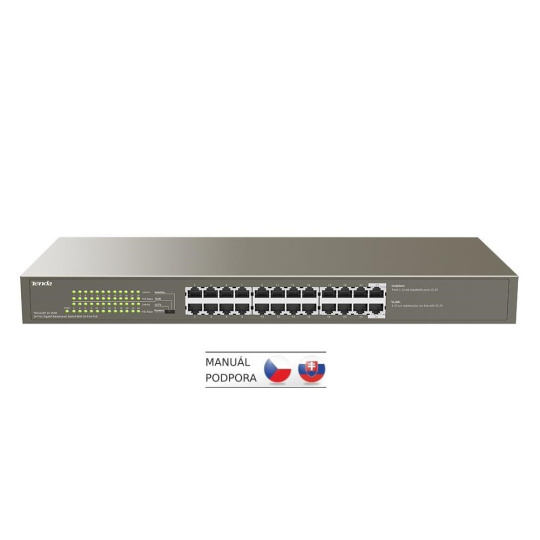 Tenda TEG1124P-24-250W přepíná data pomocí 24 portů RJ45, 24 portů 10/100/1000 Mb/s podporuje PoE802.3af/at. Switch má ochranu proti přepětí 6kV. Podpora přepojování uzlů v módu Store-and-Forward. Full-duplex kontrola toku 802.3x, half-duplex kontrola toku v režimu Back-Pressure.
