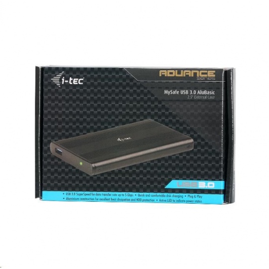 ADVANCE Series je nejvyšší řada příslušenství i-tec, která vám umožní využívat špičkové technologie produktů v moderním designu a exkluzivním balení. i-tec USB 3.0 MySafe AluBasic je externí rámeček pro všechny 2.5" SATA I/II/III HDD nebo SSD s výškou až 9.5 mm. Připojení přes USB 3.0 nabízí rychlý a snadný přenos dat (až 5 Gbps). Samozřejmostí je zpětná kompatibilita s USB 2.0. Pevná hliníková konstrukce pro optimální odvod tepla a ochranu disku. Rámeček je dodáván s USB kabelem.
