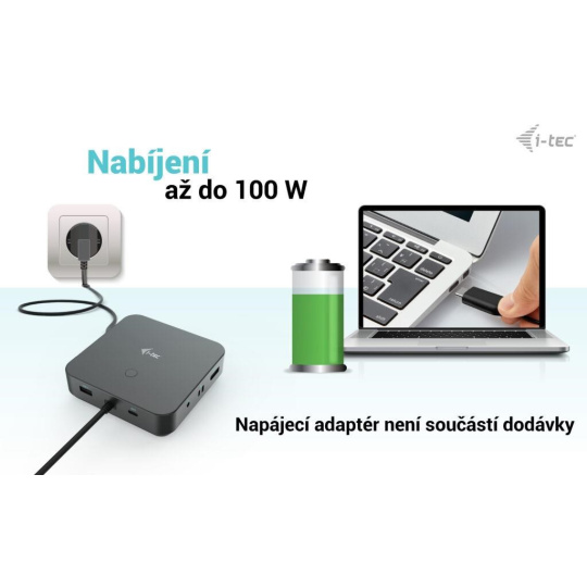 Poznámka: Napájecí zdroj není součástí dodávky. Dokovací stanici lze používat s napájecím zdrojem dodávaným s notebookem nebo lze napájecí zdroj zakoupit samostatně, například i-tec CHARGER-C112W/UK Alternativně můžete zakoupit produkt C31TRI4KDPDPRO100/UK, který již obsahuje napájecí zdroj.