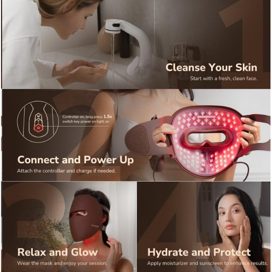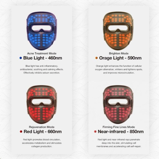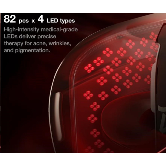 Tato maska není jen obyčejným doplňkem – je to výkonný nástroj pro komplexní omlazení a léčbu pleti. V jejím srdci se skrývá celkem 328 (82 x 4) vysoce intenzivních LED diod, které vyzařují čtyři typy klinicky ověřeného světla. Každá vlnová délka cílí na specifické problémy v různých vrstvách pokožky – od boje proti akné, přes rozjasnění pleti, až po hloubkovou stimulaci kolagenu pro redukci vrásek.