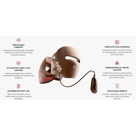 Zapomeňte na těžké a nepohodlné plastové masky. JOVS LED maska je vyrobena z prémiového, lehkého a flexibilního silikonu lékařské kvality, který se dokonale přizpůsobí unikátním konturám vaší tváře. Tím je zajištěn optimální kontakt s pokožkou a rovnoměrné ošetření. Integrované silikonové očnice účinně blokují LED světlo, ale nebrání vám ve výhledu, takže můžete během procedury pohodlně relaxovat. Díky bezdrátovému provedení máte naprostou volnost pohybu.