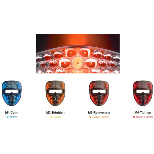 • Čtyři klinicky ověřené vlnové délky pro komplexní péči o pleť: modrá, jantarová, červená a blízká infračervená.