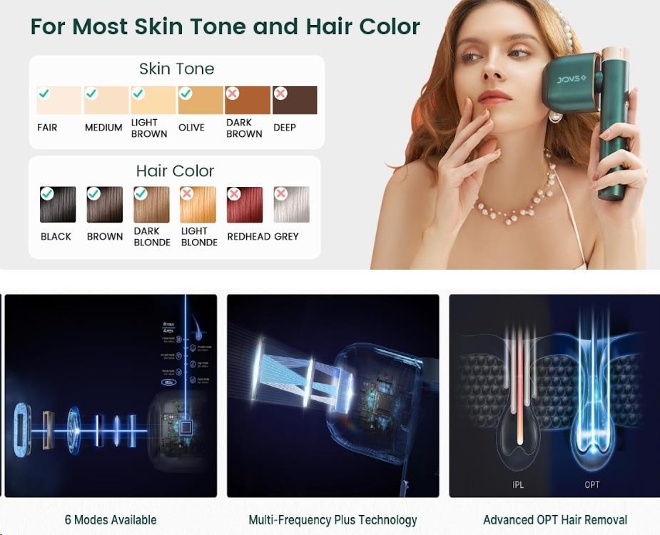 *Toto zařízení může používat kdokoli s typem pleti I až V na Fitzpatrickově stupnici. Pokud máte velmi tmavý odstín pleti (typ VI), toto zařízení prosím nepoužívejte. JOVS Pro II lze použít k ošetření tmavých blond až černých typů chloupků, ale nelze jej použít k ošetření světlých blond, zrzavých nebo šedivých chloupků.