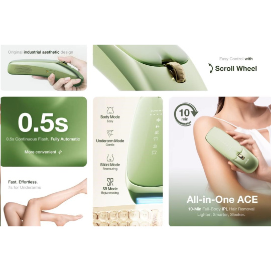 JOVS Scroll mění pravidla hry díky své impozantní energii 21 Joulů a extrémně rychlým zábleskům v intervalu pouhých 0,2 sekundy. Tato kombinace síly a rychlosti znamená, že ošetření celého těla je otázkou několika minut, nikoli hodin. Přístroj navíc nabízí víc než jen odstranění chloupků; jeho druhý režim je zaměřen na vyhlazení a omlazení pokožky, čímž získáte komplexní péči v jediném kroku.