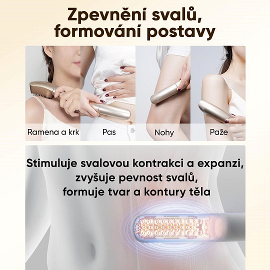 - Péče o tělo (Režim SNE): Intenzivní pulzy simulují masáž hlubokých tkání, stimulují svalové kontrakce, a tím pomáhají zpevnit a vytvarovat problematické partie jako jsou paže, břicho nebo stehna.