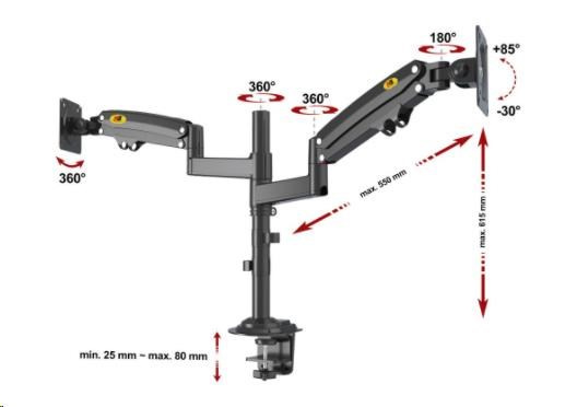 Monitorový držák na okraj stolu nebo do prostoru stolové desky, 19-32", otočný, sklopný, výsuvný, duální výškové polohování, pivot, systém pro uspořádání kabeláže, nosnost 18kg.