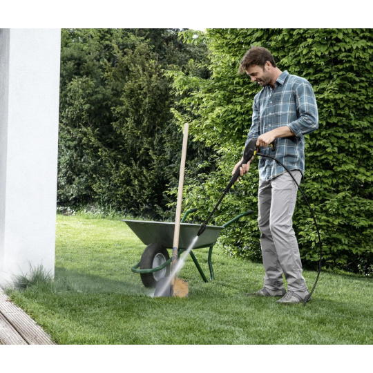 Tlaková myčka K 2 Universal si poradí s nečistotami kolem celého domu. Snadno s ní vyčistíte špínu ze zahradního nábytku, nářadí nebo jízdního kola. Díky nízké hmotnosti a pohodlnému držáku se navíc lehce přenáší. Kompaktní tělo přístroje ukrývá výkonný motor s příkonem 1400 W, který vytvoří vodní proud o tlaku až 110 barů. Třímetrová vysokotlaká hadice usnadní úklid kolem domu i čištění hůře přístupných míst. Navíc ji od přístroje snadno odpojíte. Přesná rotační tryska účinně nasměruje vodu tam, kde je zrovna třeba, a zkrotí i odolnější nečistoty. A když se vše leskne čistotou, hadici, tlakovou pistoli i napájecí kabel snadno zasunete do přístroje a jednoduše uskladníte i na malém prostoru.