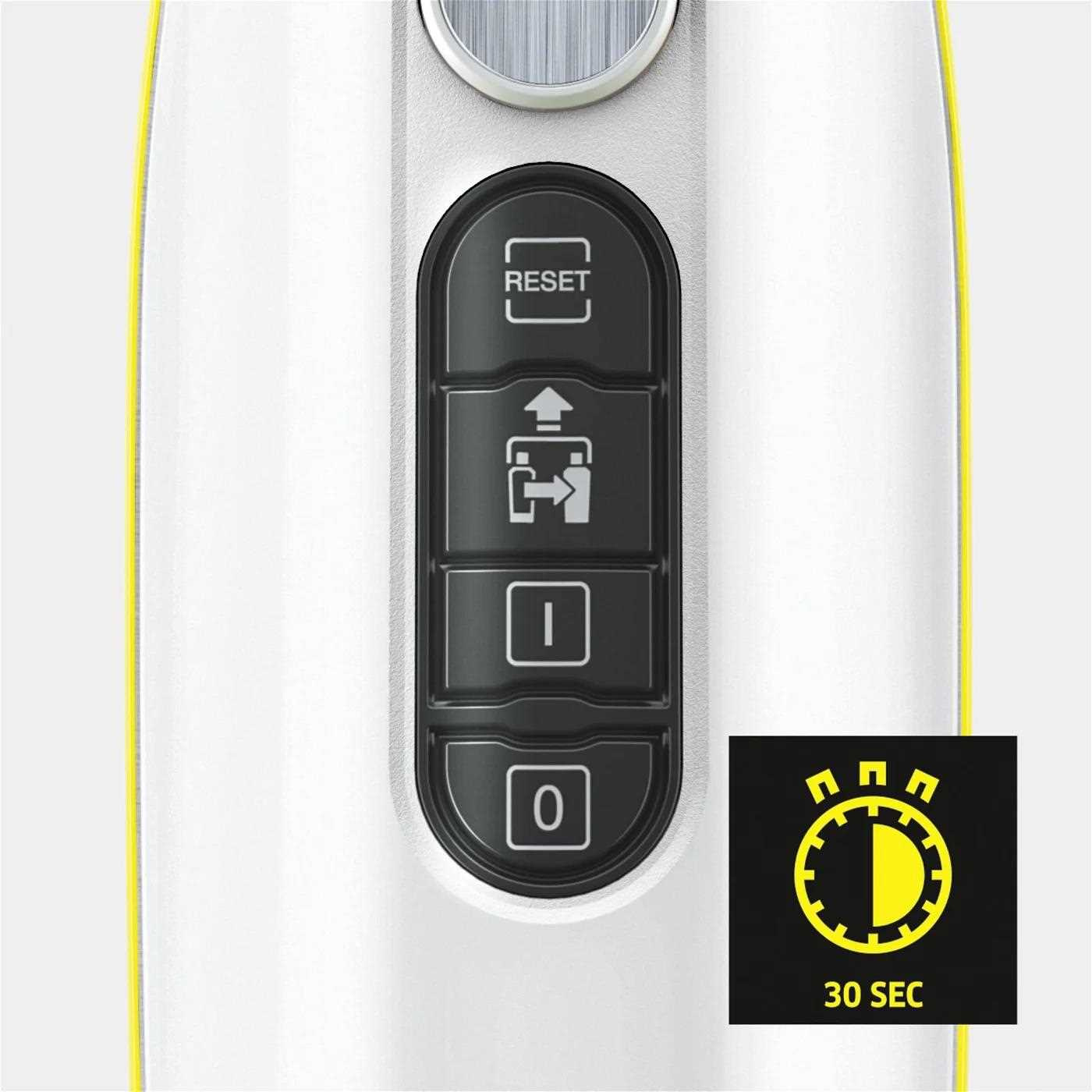 * Testy ukázaly, že při bodovém čištění po dobu 30 sekund při max. výkonu páry a přímým kontaktem s čisticím povrchem lze s parním čističem Kärcher odstranit 99,999 % obalených virů, jako je koronavirus nebo chřipka (s výjimkou viru hepatitidy B) na běžných hladkých tvrdých površích v domácnostech (testovaný zárodek: modifikovaný virus vakcína Ankara).