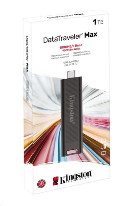 DataTraveler® Max značky Kingston je vysoce výkonný flash disk USB Type-C®1, který využívá nejnovější standard rozhraní USB 3.2 2. generace pro rekordní rychlost čtení/zápisu až 1000/900 MB/s2. Jedinečné pouzdro s prolisem, navržené s ohledem na přenosnost a pohodlí, chrání konektor, když ho nepoužíváte, a lze ho snadno přesunout jediným pohybem. DT Max nabízí špičkový výkon a rozšířené kapacity až 1 TB3, což z něj činí ideální řešení pro přenos a ukládání velkých digitálních souborů, jako jsou fotografie v rozlišení HD, videa v rozlišení 4K/8K, hudba a další.