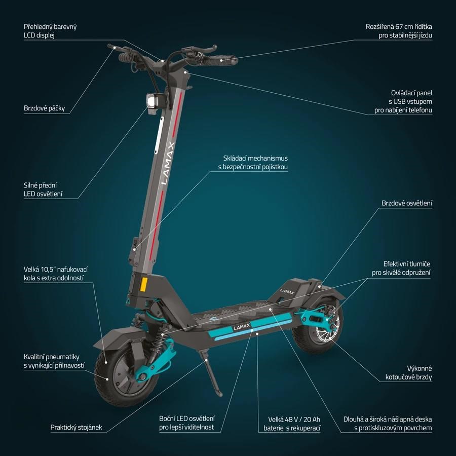 Užij si pořádnou jízdu, ať už vyrážíš do školy, práce nebo za zábavou. Elektrická koloběžka LAMAX eTank SA70 tě doveze rychlostí až 25 km/h klidně i 70 km daleko. Její moderní industriální design a 10,5palcové pneumatiky s?extra vyztuženým pláštěm odolným proti defektům a skvělou přilnavostí zvládnou každý terén. Díky přednímu i zadnímu odpružení se povezeš jako na obláčku a hezky stabilně. Opomenout nesmíme ani silné 2×800W motory s rekuperací. Svištět si to můžeš, i když nejsi žádný drobek, nosnost má koloběžka až 150 kg. Všechno, co potřebuješ vědět o svojí jízdě, ti ukáže velký přehledný LCD displej, včetně toho, který ze čtyř rychlostních stupňů a dvou výkonnostních režimů používáš. Bezpečnost zajišťuje ochrana proti nechtěnému rozjezdu a LED osvětlení celé koloběžky. Pevná konstrukce s velkou nášlapnou plochou se dá snadno a rychle složit a koloběžka má i parádní zabezpečení proti nenechavcům.