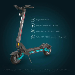Nezáleží na tom, jestli se proplétáš městským labyrintem nebo brázdíš náročnější terén, LAMAX eTank SA70 tě všude podrží. Její tělo v moderním industriálním designu je pevné, stabilní a odolné. V každém detailu vidíš dokonalou kvalitu zpracování. Koloběžka uveze až 150 kg zátěž, a to bez obtíží i do kopce díky silným motorům o výkonu 2×800 W. Můžeš ale zvolit mezi 2 výkonnostními režimy, úsporný využívá motory jen na 60 %, i tak se parádně svezeš, nebo to rozjeď naplno. Při jízdě z kopce nebo brždění rekuperace vrací šťávu zpátky do vysokokapacitní lithiové baterie 48 V/20 Ah, ta je vybavena BMS inteligentním systémem, který ji chrání proti přehřátí nebo třeba podbití. Dojedeš tak v ideálních podmínkách až 70 km. Na výběr máš ze 4 rychlostních stupňů, přičemž maximálka činí 25 km/h, což už hezky sviští a po městě ideál.