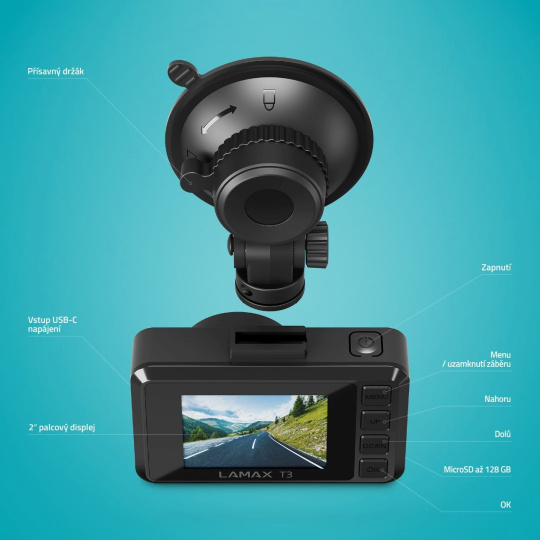 Provoz na silnicích si žádá někdy opravdu pevné nervy a je taktické být připravený na ledacos. Když chceš předejít hádkám při případné kolizi nebo si prostě jenom zdokumentovat krásy, které po cestě vidíš, autokamera LAMAX T3 ti bude zdatně sekundovat. Pokud učíš nové řidiče, pořídíš s ní i super výukový materiál z reálného provozu. Záběry ukládá kamera v reálném Full HD a díky G-senzoru je automaticky ochrání, aby zůstaly po ruce pro případ potřeby. Ochranu záběrů můžeš zapnout i manuálně stiskem tlačítka. Vše si pak pohodlně uložíš na microSD o kapacitě až 128 GB. Neboj se, že by ti kamera zkolabovala v nejméně vhodnou chvíli, místo baterie je vybavena superkondenzátorem, který je odolnější. Pokud je kamera napojena na trvalé napájení, parkovací režim se postará o nonstop monitoring vozidla. Na přehledném 2” displeji vidíš vše potřebné, třeba při nastavování funkcí v českém menu, což zvládneš jednoduše jako nic. Designově vymazlená kamera skvěle sedne do přísavného držáku, který ji nepustí ani při dravější jízdě. Ještě je fajn vědět, že máš k dispozici USB-C konektor a za slušnou cenu dostaneš super krytí zad.
