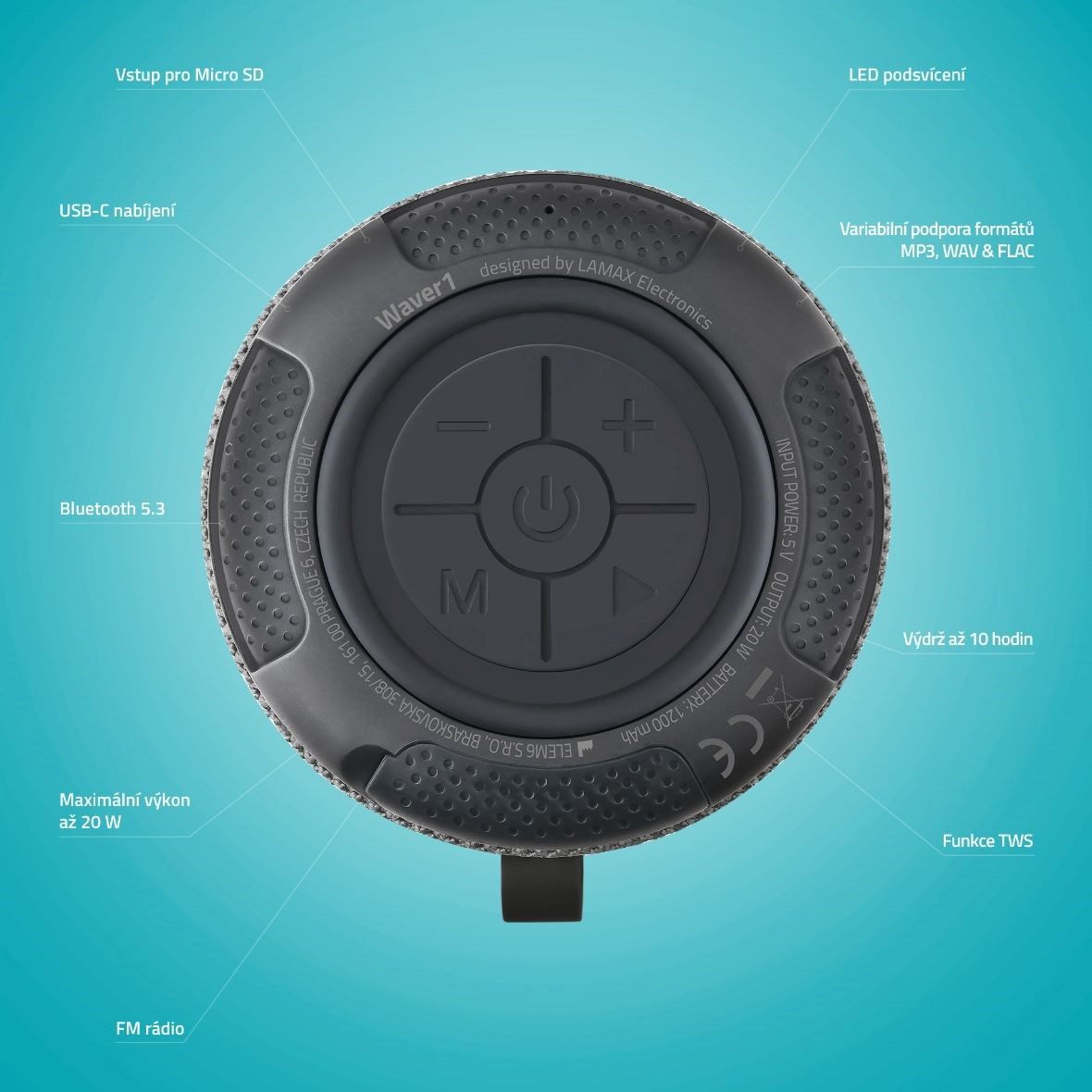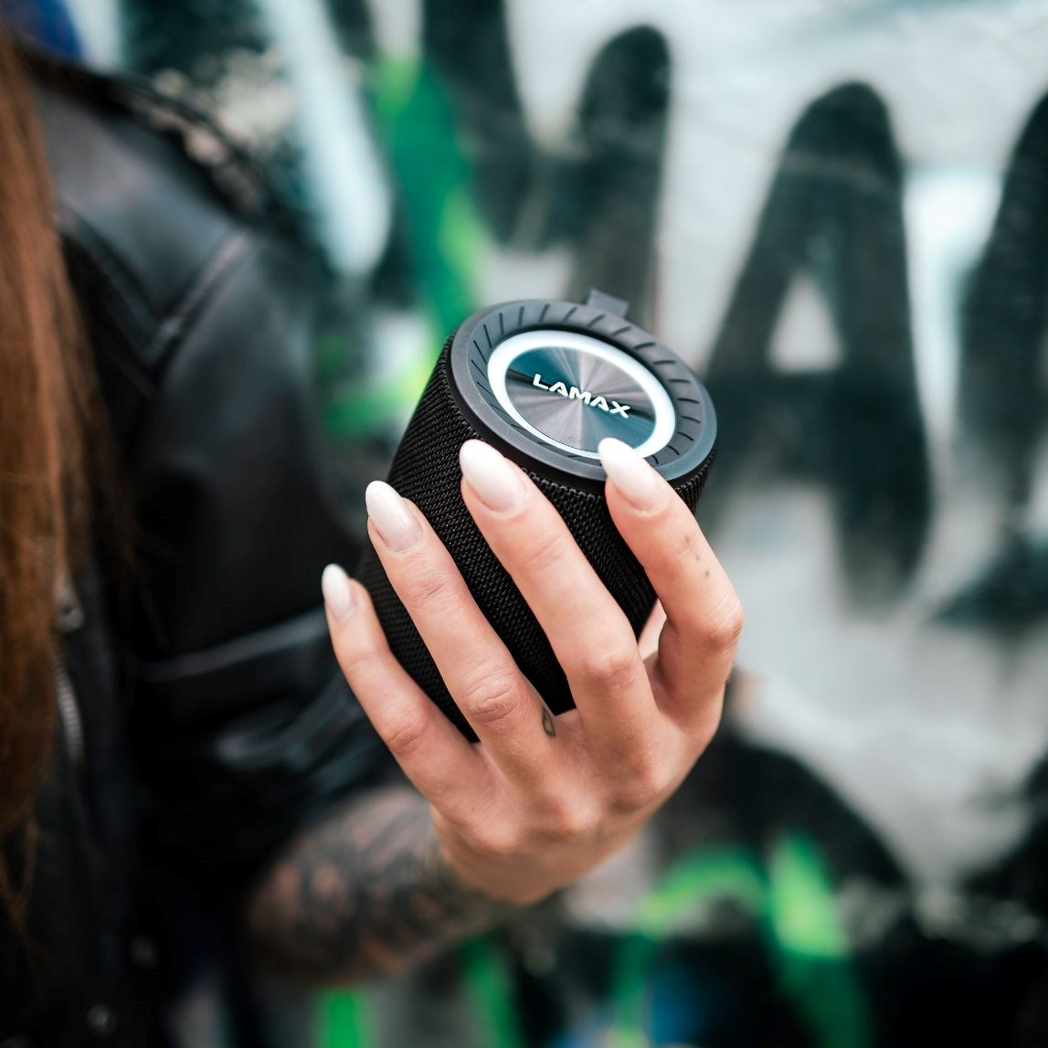 LAMAX Waver1 je kompaktní moderní fešák, kterýmu zkrátka neodoláš. Jeho ergonomický koženkový design není jenom líbivý, ale taky praktický. Můžeš ho s sebou vzít kamkoliv, stačí mu fakt málo místa a díky voděodolnosti IP65 mu neuškodí ani vlhčí prostředí třeba v létě u bazénu. I když má výdrž, občas potřebuje doplnit šťávu, k tomu slouží USB-C kabel.