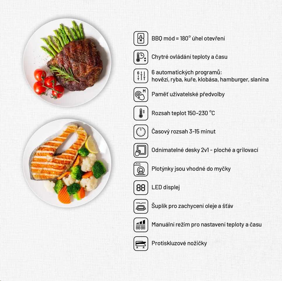 Díky výkonu 2000W si gril bez problému poradí i s prudkým opečením, které je potřeba u kvalitních steaků a disponuje dostatečnou grilovací plochou 1400 cm2. Součástí grilu je praktická miska na odkapávání přebytečného tuku a šťávy. Příjemným bonusem je kvalitní designové provedení vhodné do exteriéru i interiéru.