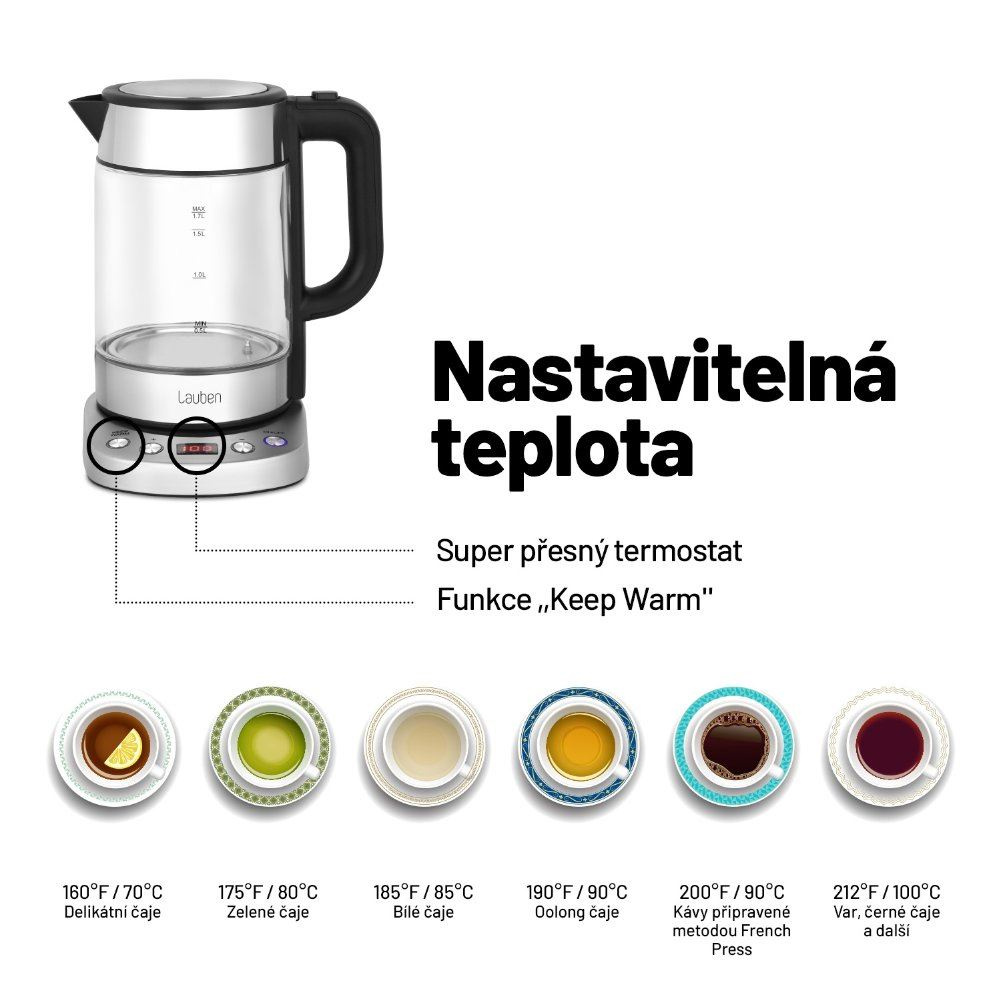 Lauben Electric Kettle EK17GS je designová rychlovarná konvice s nastavitelnou teplotou ohřevu vody a Keep Warm funkcí. Možnost nastavení teploty vody v kuchyni jistě oceníte. Potřebujete zalít zelený čaj? Už nikdy nemusíte čekat, až voda vychladne, stačí si preferovanou teplotu zvolit na přehledném LCD displeji.