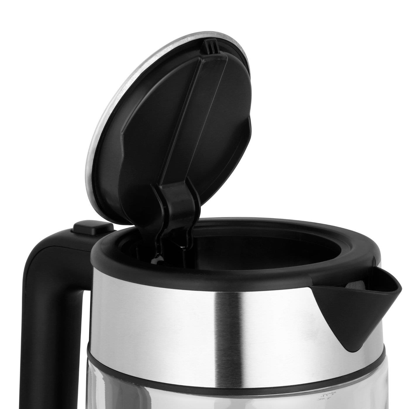 Skleněná rychlovarná konvice, 1,7 l, 2200 W, nastavitelná teplota 60 - 100°C po deseti stupních, funkce Keep Warm, velký LED displej, podsvícená tlačítka, pojistka proti přehřátí a vaření nasucho, vyjímatelný omyvatelný filtr, otočná základna, prostor pro kabel, One-Touch otvírání.... více