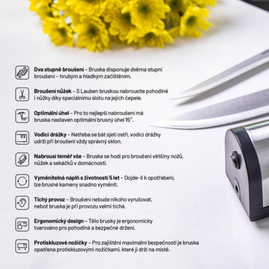 Vždy dobře nabroušené ostříDobře nabroušený nůž je základem kuchyně. Dnes už ale nemusíte hledat brusiče nožů, díky brusce na nože Lauben Knife Sharpener 4700SB jej budete mít stále po ruce. Bruska zvládne hrubé i hladké začištění a hodí se pro většinu nožů, sekáčků či nůžek. Kvalitní nabroušení zajišťuje optimální brusný úhel 15° a vodicí drážky pro udržení správného sklonu. Brusný kámen je v případě potřeby možné vyměnit, životnost je zhruba pět let. Bruska má ergonomický tvar, vyznačuje se tichým provozem a je vyrobena z nerezu, takže ji jen tak něco neublíží. Bezpečnost při provozu zajišťují protiskluzové nožičky.