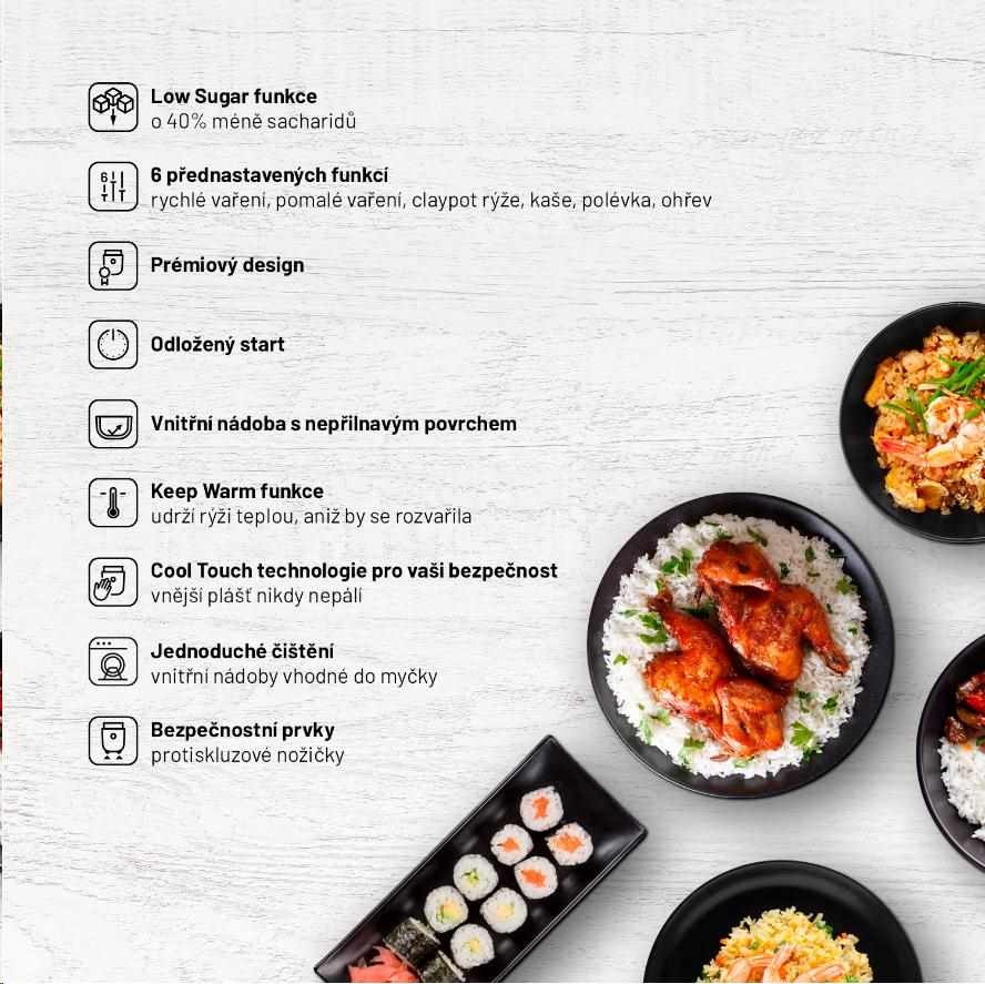 Příznivce zdravého životního stylu potěší rýžovar Lauben zejména funkcí low sugar. Speciální technologie v průběhu vaření automaticky oddělí přebytečné cukry od škrobu, který rýže obsahuje. Tyto přebytečné rychlé cukry jsou v průběhu vaření od rýže separovány a přeměněny v želatinu ve vnitřní poklici. Pokud často jíte ve spěchu, a přesto se chcete stravovat zdravěji, Lauben Low Sugar Rice Cooker je pro vás tím správným pomocníkem. Nutričně bohaté sacharidy v rýži zůstanou a přebytečné cukry skončí v odpadu, místo ve vašem jídelníčku. Ne nadarmo se říká, že jste to, co jíte. Správnou konzumací sacharidů předcházíte zvýšené hladině cukru v krvi, obezitě a příznivě ovlivňujete chod vašeho organismu. Díky nepřilnavému provedení navíc nevyžaduje příprava vašeho oblíbeného jídla žádný přidaný tuk. S Lauben Low Sugar Rice Cooker připravíte zdravá jídla s vynaložením minimálního úsilí a uděláte významný krok směrem ke zdravému stravování.