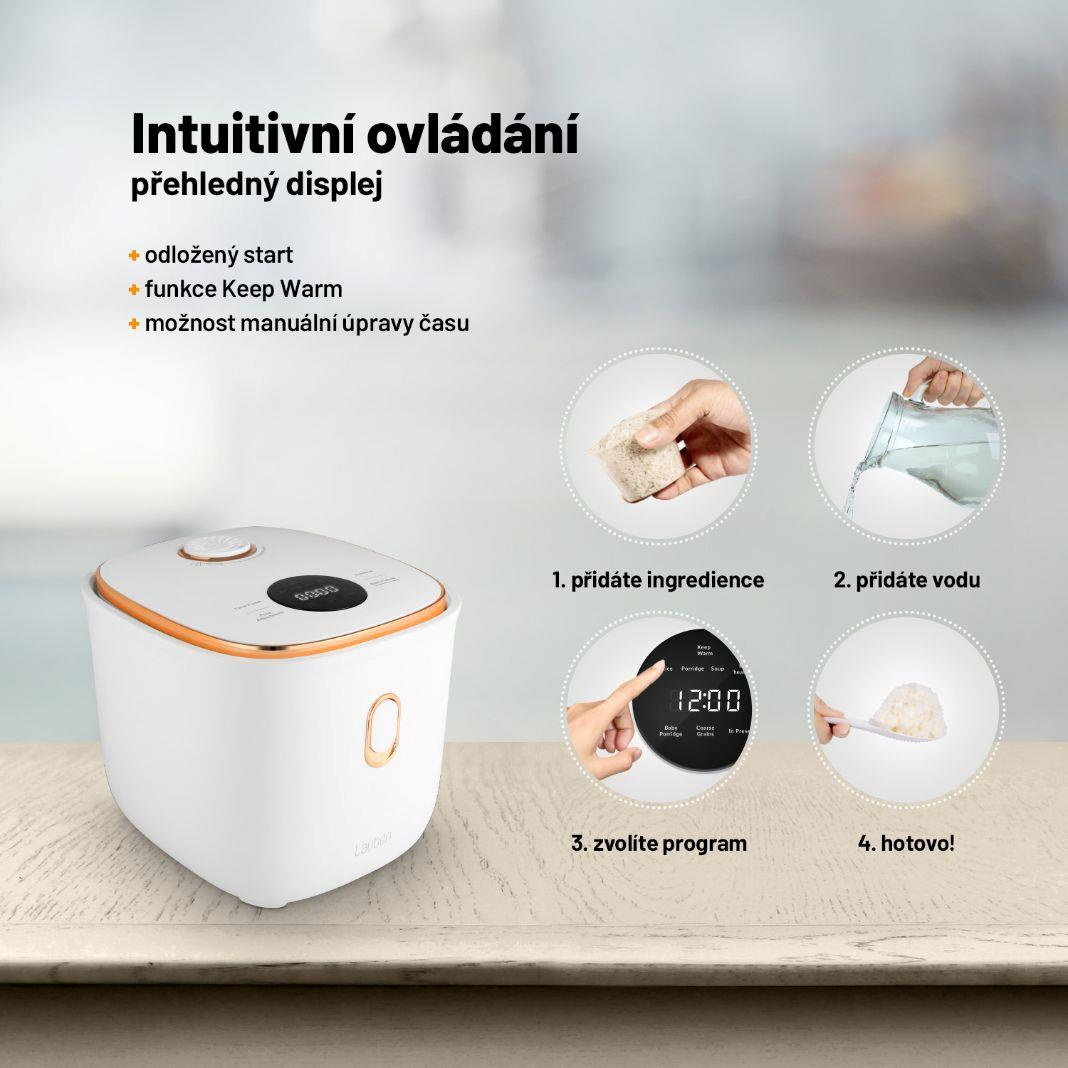 Každý, kdo si potrpí na prvotřídně připravené pokrmy a zároveň nechce trávit mnoho času v kuchyni, by se měl vybavit multifunkčním rýžovarem. Lauben Multifunction Rice Cooker 1200WR připraví po stisku jediného tlačítka všechny druhy rýže tím správným způsobem. Navíc disponuje 6 přednastavenými funkcemi – Rice, Porridge, Soup, Re-heat, Baby Porridge, Coarse Grains – pro snadnou přípravu polévek, kaší, obilovin či opětovný ohřev. Zdá se vám program krátký? Upravte si ho, některé umožňují manuální nastavení času.