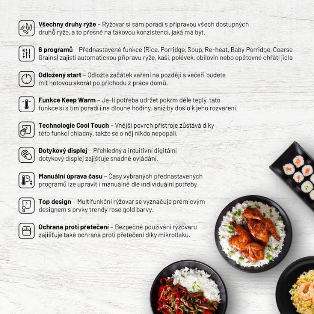 Vařte s lehkostí, chutně a stylověEfektivita, snadné použití a design mají společného jmenovatele, je jím víceúčelový rýžovar Lauben Multifunction Rice Cooker 1200WR Rose Gold Edition. Stiskem jediného tlačítka uvaří všechny druhy rýže na správnou tvrdost a 6 přednastavených funkcí vykouzlí další pokrmy jako kaše nebo polévky. Čas některých programů si však na intuitivním dotykovém displeji můžete nastavit i manuálně. Díky funkci odloženého startu lze mít jídlo připraveno už po návratu domů, opozdilci zase ocení funkci Keep Warm, která udrží pokrm teplý bez rozvaření. Porce nasytí jednotlivce i páry, jež pak mají více času pro sebe, protože ani údržba nezabere čas. Vnitřní hrnec lze dát do myčky. Bezpečné používání zajišťuje ochrana proti přetečení a technologie Cool Touch proti popálení. Rýžovar bude ozdobou každé kuchyně, kterou rozzáří trendy rose gold barvou, a přitom nezabere takřka žádné místo.