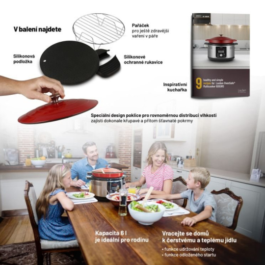 Víceúčelový Lauben OvenSafe® Multicooker 6000RS rozhodně nedělá ostudu svému označení. Vnitřní hrnec je poctivý litinový se smaltovaným povrchem – jako od babičky! Díky technologii OvenSafe® lze bez obav vložit do trouby či postavit na různé typy sporáků, zvládá teplotu až 250°C. Protože je 21. století v plném proudu, nádobu o objemu 6 l lze vložit i do multicookeru a rázem máte k dispozici 10 přednastavených programů pro snadné a rychlé vaření. Teplotu a čas je však možné upravit i ručně. Důležitou součástí hrnce je poklice, ta je navržená tak, aby k distribuci vlhkosti uvnitř docházelo rovnoměrně. Litina dokonale absorbuje a vede teplo a tím je vaření energeticky úspornější, smaltovaný povrch zabraňuje korozi. Jídlo připravíte snadno i v páře díky přiloženému pařáčku. Šikovnými pomocníky jsou funkce pro udržování teploty a odložený start. Manipulaci usnadňují přiložené silikonové rukavice a podložka, inspiraci přináší kuchařka.
