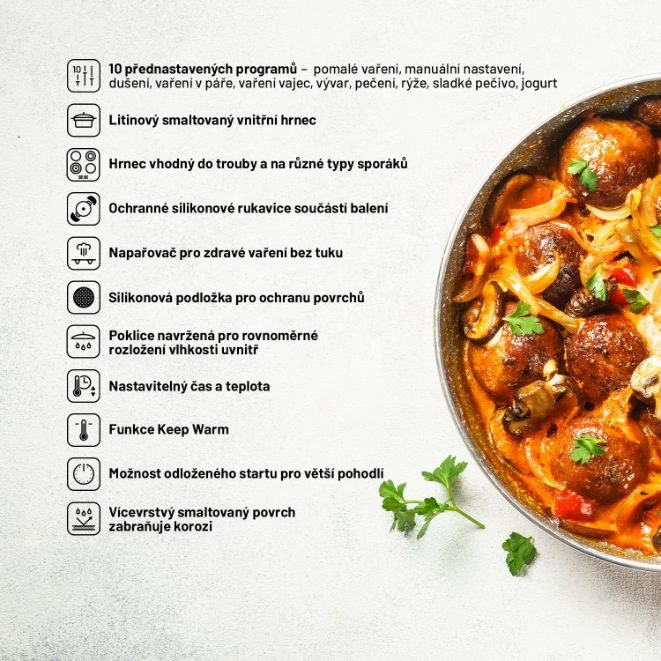 Multifunkční hrnec objem 6 l, litinový smaltovaný hrnec OvenSafe® vhodný na sporák či do trouby, vhodné do myčky, 10 programů, napařovač pro ohřev zeleniny, silikonové rukavice v balení, silikonová podložka v balení, regulace teploty, vyjímatelná nádoba a odložený start, časovač, udržení teploty, termostat, displej, automatické vypnutí.... více
