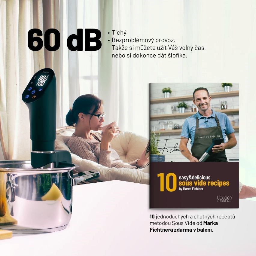 Chcete si pochutnat na vynikajícím, zdravém jídle, jehož příprava vám nezabere celé odpoledne? Chcete si doma připravit maso, co se bude rozpadat na jazyku, ale přitom neztratí na objemu a vždy si zachová svůj tvar a barvu? Nemusíte nutně chodit do restaurace. Lauben Smart Sous Vide je ideálním pomocníkem do kuchyně pro každého, kdo chce ušetřit hodiny strávené u sporáku, a přesto dostat z ingrediencí maximum. Díky metodě vaření sous vide si připravovaná jídla zachovají všechny chutě, vůně a živiny, o které nechcete při vaření přijít. Vařič jednoduše zapnete a ponoříte do hrnce s potravinami připravenými ve speciálních zip lock sáčcích, které jsou součástí balení. O ostatní už se Lauben Smart Sous Vide postará, vy si jen vychutnáte famózní výsledek.