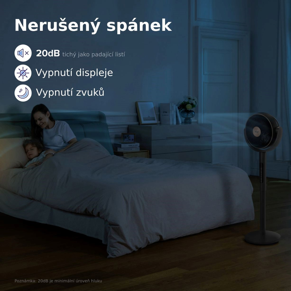 Levoit R432 Cyclone je navržen pro maximální pohodlí uživatele. Jeho konstrukce umožňuje nastavení výšky, takže jej lze použít jako stojanový nebo stolní ventilátor. Díky 120° horizontální a 90° vertikální oscilaci zajišťuje rychlou a rovnoměrnou cirkulaci vzduchu v místnosti. Jednou z klíčových vlastností tohoto ventilátoru je jeho mimořádně tichý provoz s minimální hlučností pouhých 20 dB, což je ideální pro použití během spánku nebo při práci vyžadující soustředění. V režimu spánku se navíc displej automaticky vypíná, aby nerušil váš odpočinek.