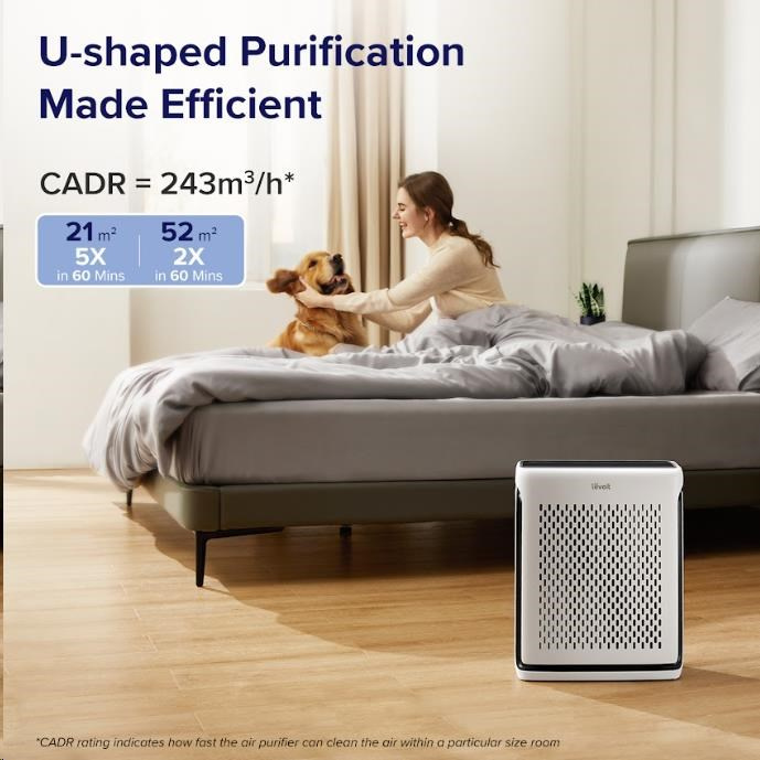Levoit Vital 100S disponuje výkonem až 243 m3/h CAD a vyčistí dvakrát za hodinu místnost o velikosti až 52 m2 a až pět krát za hodinu místnost o velikosti 21 m2.