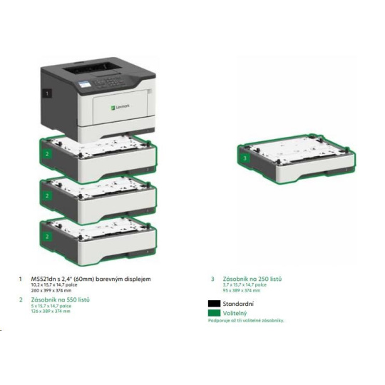 Obecné specifikace Část č. 36S0310 Technologie tisku  Monochrome Laser Velikost pracovní skupiny  Střední pracovní skupina Displej  2,4" (60mm) barevný LCD displej Podporované rozměry médií  A6, Oficio, 7 3/4 Envelope, 9 Envelope, JIS-B5, A4, Legal, A5, Letter, Statement, Executive, Universal, DL Envelope, Folio, 10 Envelope Manipulace s papírem zahrnuta  100-Sheet Multipurpose Feeder, Integrated Duplex, Výstupní přihrádka na 150 listů, Integrovaný zásobník na 250 listů Standardní porty  Gigabit Ethernet (10/100/1000), Port USB 2.0 Specification Hi-Speed Certified (typ B) Rozměry (V x D x Š)  260 x 399 x 374 mm Hmotnost  14.1 kg Rozměry balení (V x D x Š)  376 x 430 x 470 mm Hmotnost balení  15.99 kg Tisk Rychlost tisku  44 str./min.1 Rychlost tisku oboustranně)  Až: černobíle: 22 str./min. (A4) Čas první stránky  černobíle: 6.0 sekund Rozlišení tisku  černobílého: 1200 x 1200 dpi, Kvalita 2400, 300 x 300 dpi, 600 x 600 dpi, Kvalita 1200 Duplexní  oboustranný: Integrated Duplex Oblast tisku  4.0 mm od všech okrajů (včetně) Manipulace s papírem Podporované typy médií  Papírové štítky, Tvrdý papír, Obyčejný papír, Transparencies, Envelopes, vinylové štítky, viz Card Stock & Label Guide Možnost dokončování  No Počet vstupů papíru  standardně: 2 maximálně: 5 Kapacita vstupu papíru  standardně: 350 stránek maximálně: 2000 stránek 350 stránek Kapacita výstupu papíru  Až: standardně: 150 stránek maximálně: 150 stránek Podporovaný rozsah gramáže papíru  60 - 120 g/m2 (standardní zásobník) 60 - 216 g/m2 (multifunkční zásobník) Doporučený měsíční objem tisku  2000 - 15000 stránek2 Maximální měsíční funkční cyklus  120000 stránek za měsíc3 Kazety a zobrazování Počty vytištěných stránek u kazet pro tiskárny  až: 15,0004 -page High Yield Cartridge Kazeta na 6 0004 stran Extra vysokokapacitní kazeta na 20 0004 stran Ultra vysokokapacitní kazeta na 25 0004 stran Odhadovaný počet vytištěných stránek na zobrazovací válec  Max.: 60000 stran při tisku 3 běžných stran/A4 na jednu tiskovou úlohu a při 5%pokrytí5 Tisková náplně dodávány s produktem  První tonerová kazeta na 5 0000 stran, zařazená do vratného programu Náhradní kazety:  Product functions only with replacement cartridges designed for use in a specific geographical region. See www.lexmark.com/regions for more details. Hardware Procesor  1.0 GHz MHz Paměť  standardně: 512 MB maximálně: 512 MB Pevný disk  Není k dispozici Jazyk tiskárny  standardně: PCL 5e Emulation, PCL 6 Emulation, Microsoft XPS (XML Paper Specification), Personal Printer Data Stream (PPDS), PostScript 3 Emulation, PDF 1.7 emulation, Direct Image, AirPrint™ Fonty a znakové sady  2 PCL bitmap fonts, OCR-A, OCR-B scalable PCL 5e fonts, For more information, refer to the Technical Reference., 84 scalable PCL fonts, 91 škálovatelných PostScript fontů, 3 of 9 scalable PCL 5e fonts in Narrow, Regular and Wide, 5 PPDS bitmap fonts, 39 scalable PPDS fonts Dotykový displej  No Možnosti připojení Přímé USB  Ne Síť Ethernet  Yes Bezdrátová  Bezdrátové příslušenství Podpora síťových protokolů  TCP/IP IPv6, TCP/IP IPv4, AppleTalk™, TCP, UDP Metody síťového tisku  LPR/LPD, Pull Printing, Microsoft Web Services WSD, Secure IP (Port 96xx), FTP, TFTP, Enhanced IP (Port 9400), ThinPrint .print integration, IPP 1.0, 1.1, 2.0 (Internet Printing Protocol) Protokoly pro síťový management  DHCP, APIPA (AutoIP), mDNS, IGMP, WINS, DDNS, SNMPv3, SNMPv1, SNMPv2c, Telnet, NTP, ICMP, HTTP, DNS, ARP, HTTPs (SSL6 /TLS), Finger Síťové zabezpečení  SNMPv3, 802.1x Authentication: MD5, MSCHAPv2, LEAP, PEAP, TLS, TTLS Volitelné síťové porty  Marknet N8370 WiFi Option Podporované operační systémy Podporované operační systémy Microsoft Windows  Windows 10, Windows 8.1, Windows 8, Windows 8 x64, Windows 7 x64, Windows 8.1 x64, Windows 7 Podporované operační systémy Apple  Apple OS X (10.6, 10.7, 10.8, 10.9, 10.10, 10.11, 10.12) Podporované operační systémy Linux  Debian GNU/Linux 7.0, 8.0, Ubuntu 16.04 LTS, Fedora 23, 24, openSUSE Linux 42.3, Red Hat Enterprise Linux WS 6, 7, openSUSE Linux 13.2, SUSE Linux Enterprise Server 10, 11, 12 Citrix MetaFrame  Microsoft Windows 2000 Server running Terminal Services with Citrix MetaFrame XP Presentation Server or Citrix MetaFrame Presentation Server 3.0., Microsoft Windows Server 2012 with Citrix XenApp 6.0, 6.5, Microsoft Windows 2000 Server running Terminal Services with Citrix Presentation Server 3.0, 4.0, Microsoft Windows 2000 Server running Terminal Services with Citrix Presentation Server 4.0 Podporované operační systémy Novell  Novell Open Enterprise Server on SUSE Linux Enterprise Server, Novell NetWare 5.1(SP 6+), 6.0(SP 3+) with Novell Distributed Print Services (NDPS), Novell Open Enterprise Server 2 SP2 on SuSE Linux Enterprise Server 10 SP3 3, Novell NetWare 6.5 Open Enterprise Server, Novell Open Enterprise Server 11 on SUSE Linux Enterprise Server 11, Novell Open Enterprise Server 2 on SUSE Linux Enterprise Server 10 SP4 Podporované operační systémy UNIX  Sun Solaris x86 10, 11, Sun Solaris SPARC 10, 11, IBM AIX 6.1, 7.1 Elektrické napájení a provoz ENERGY STAR  Yes Obvyklá spotřeba energie podle standardu Energy Star  1.8 kilowatthodin za týden Hlučnost / Hlučnost v činnosti  14 dB (nečinná) 56 dB (Tisk) Hlučnost při oboustranném tisku  pracovní režim: 55 dB Průměrná spotřeba v režimu hibernace / Průměrná spotřeba v režimu spánku / Průměrná spotřeba energie v režimu Připravena / Průměrná spotřeba energie při tisku  0.1 watts 2.0 watts 8 watts 620 watts Předepsané provozní podmínky  Vlhkost: 8 až 80% relativní vlhkosti Teplota: 16 až 32°C Nadmořská výška: 0 - 5000 metrů Certifikace produktu  ENERGY STAR, ICES-003 Class B, BSMI Class B, VCCI Class B, US FDA, UL 60950-1, FCC Class