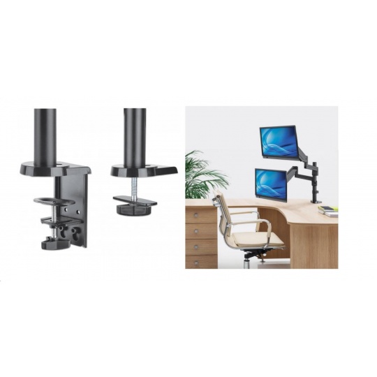 The Manhattan Universal Gas Spring Dual Monitor Mount securely supports two 17" to 32" TVs or monitors. Because it uses gas springs to hold your displays, the arms only need the lightest touch to move them to the best viewing angles for your purposes. The mount's high-quality aluminum and steel construction will provide years of reliable service. Ideal for installation on a large desk, the Manhattan Universal Gas Spring Dual Monitor Mount lets you take advantage of the extra range of movement so you can have more space to get work done.